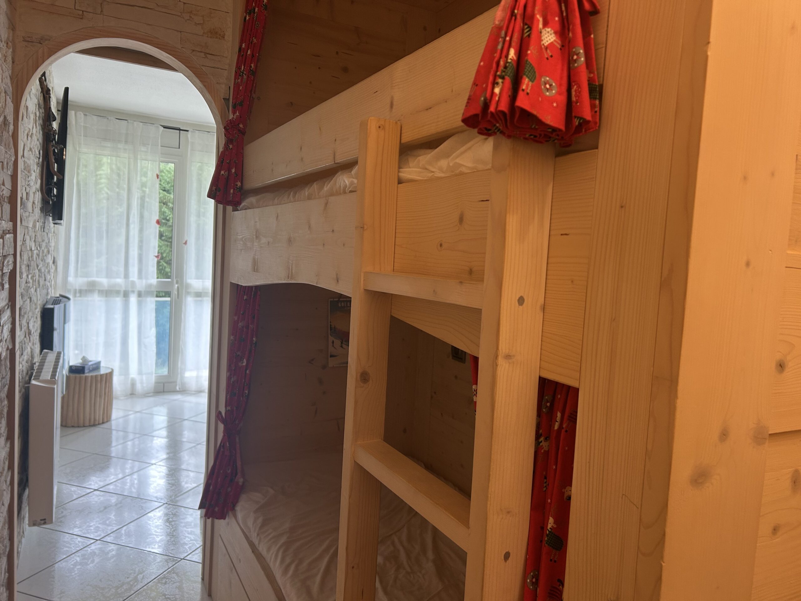 Coin nuit fermé et séparé avec lit superposé. Lit-armoire dans le salon permettant de gagner beaucoup de place la journée. Louable/Habitable immédiatement.
